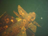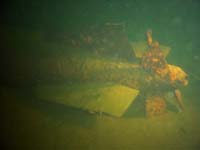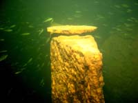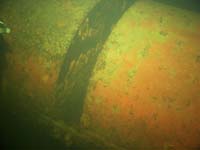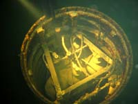 Diese auf ca. 25 m Tiefe liegende Zielplattformen wirken wie riesige Schwimmstege. An diesem etwa 42 x 5 m großen Ponton sind noch die Signal- und Hilfsruderanlage, Reling, Poller, Planken und weitere Aufbauten vorhanden.
